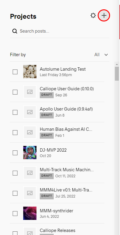 Step 1 : On the main navigation of the website on the left, click on the Project’s Tab to go into the Projects Page. Click on the “+” button that is highlighted in red at the bottom. In case you want to edit an existing project, one can simply Search posts and edit.